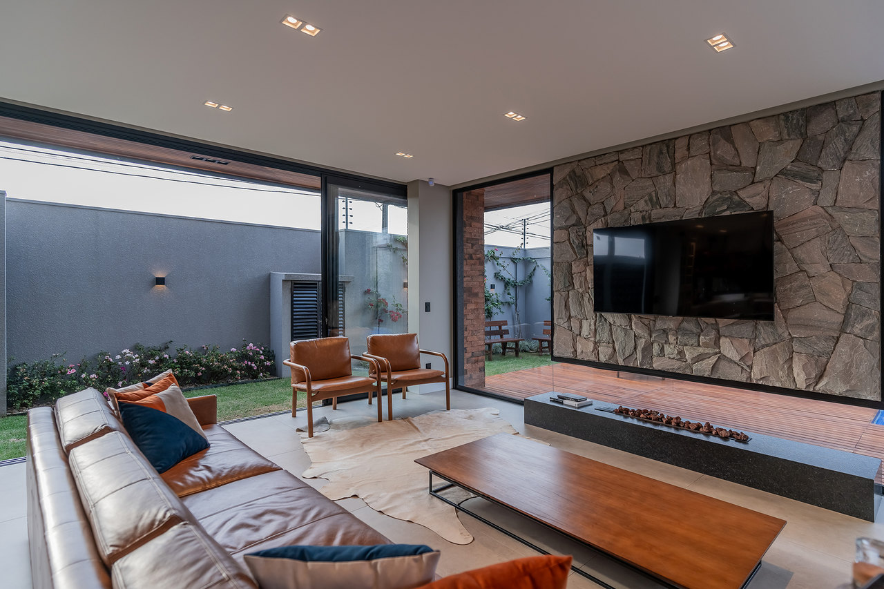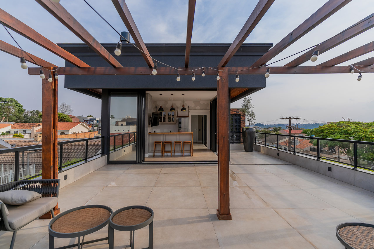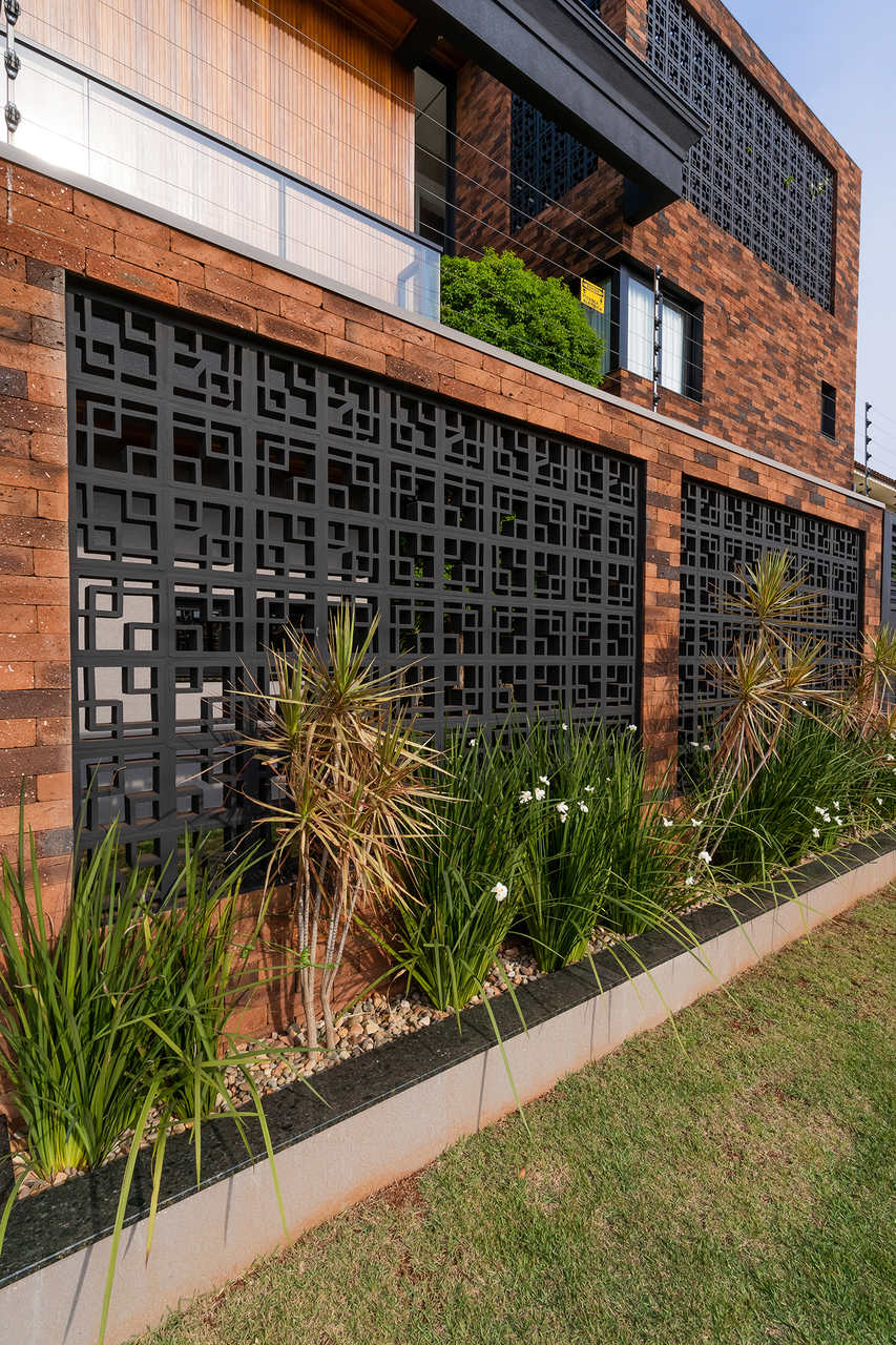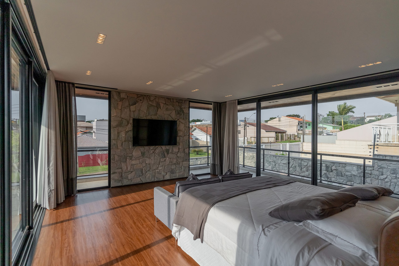 Esse sobrado imponente mistura alguns estilos com texturas e revestimentos, que trazem a harmonia e o conforto perfeitos para um lar. Os detalhes em madeira contrastam com os acabamentos industriais, ao mesmo tempo que a atenção se volta para a parede especialmente feita em pedras, ao lado da piscina.