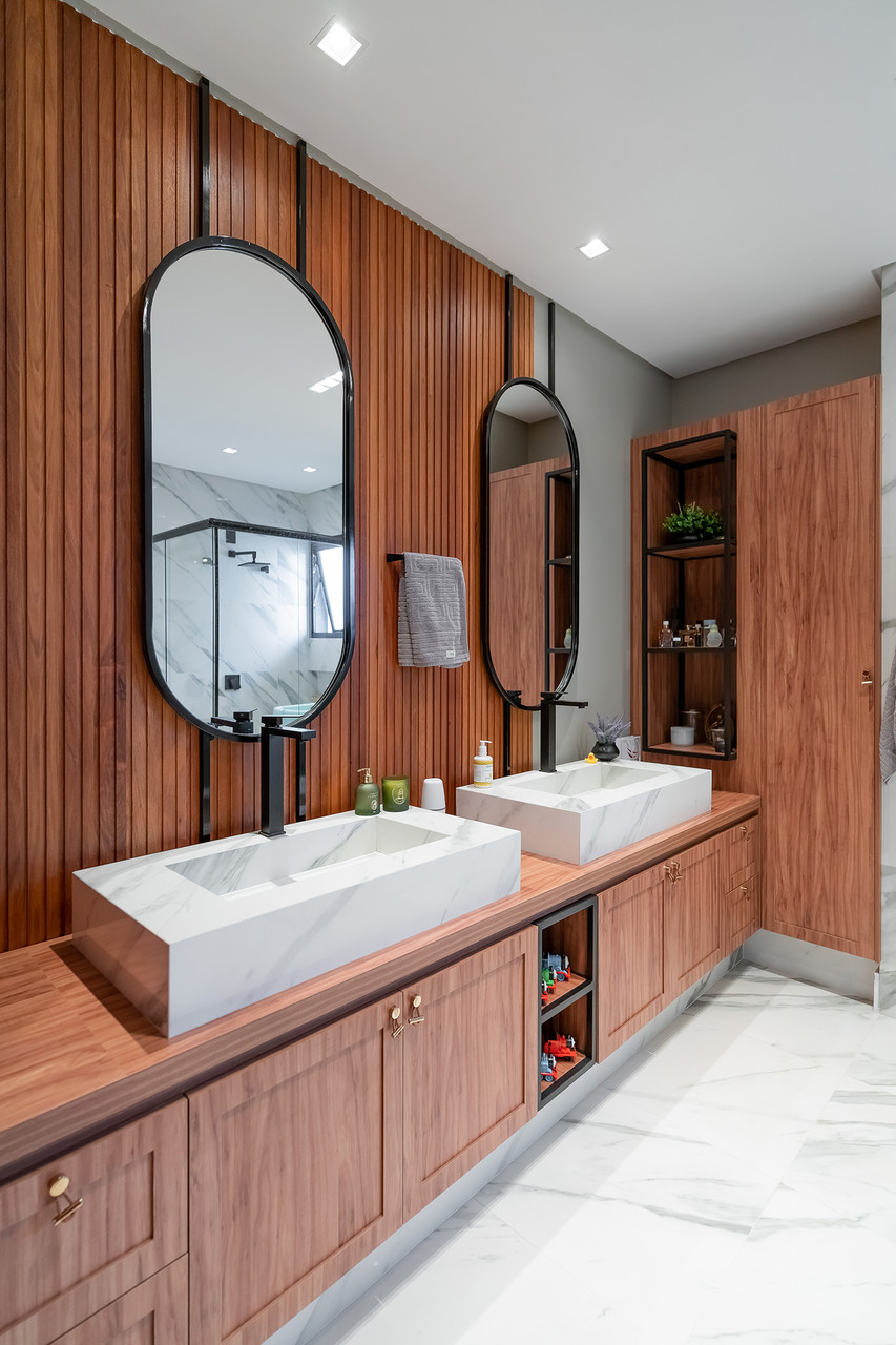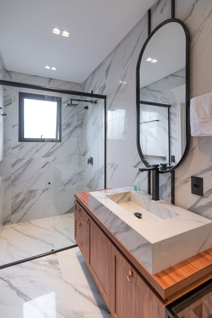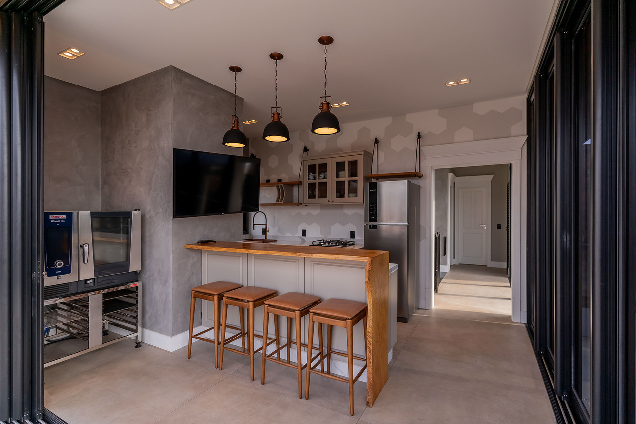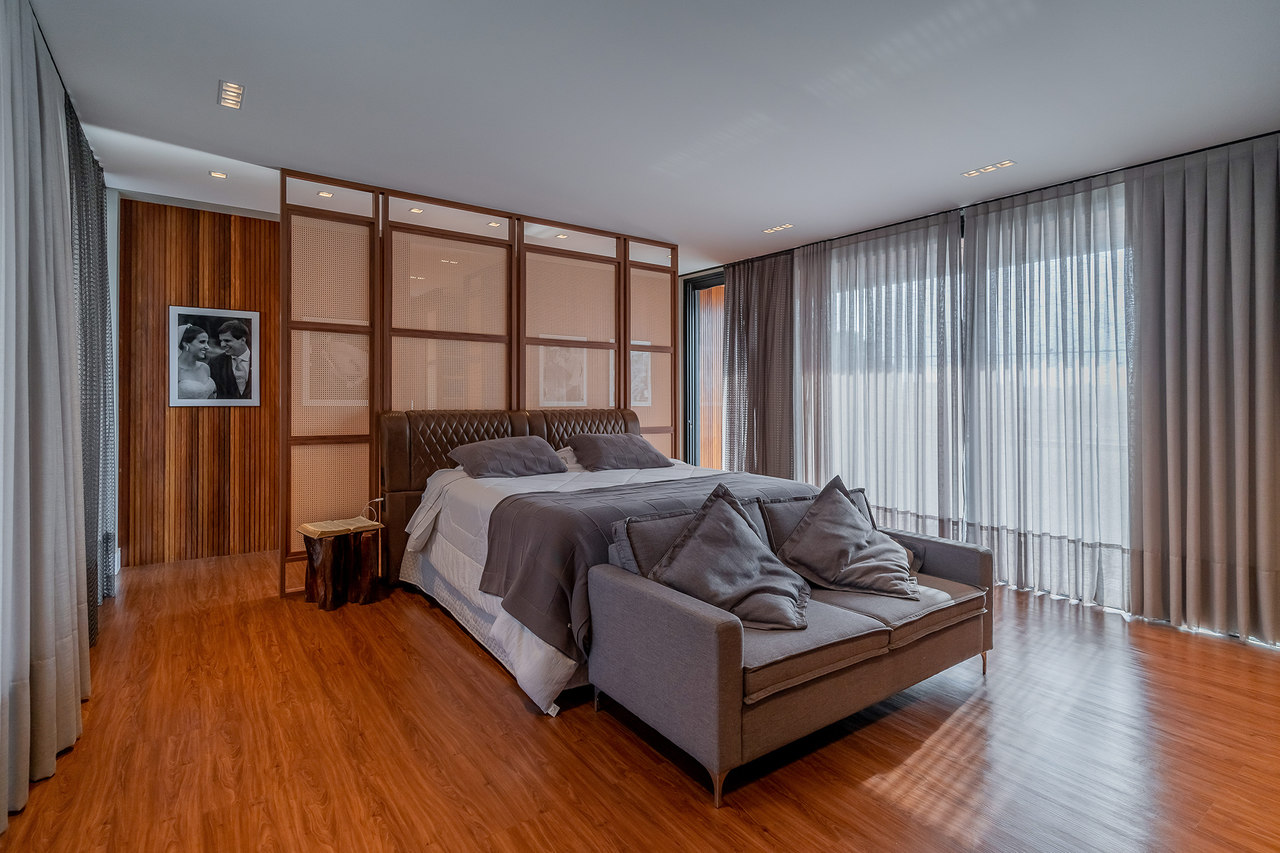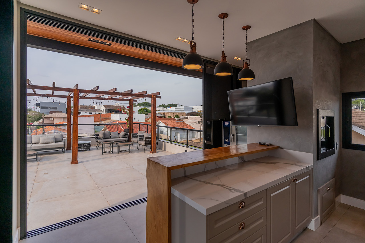 Esse sobrado imponente mistura alguns estilos com texturas e revestimentos, que trazem a harmonia e o conforto perfeitos para um lar. Os detalhes em madeira contrastam com os acabamentos industriais, ao mesmo tempo que a atenção se volta para a parede especialmente feita em pedras, ao lado da piscina.