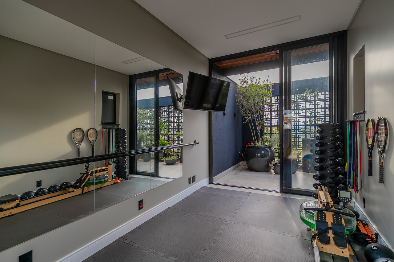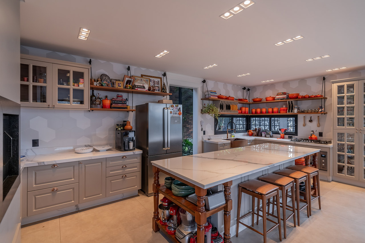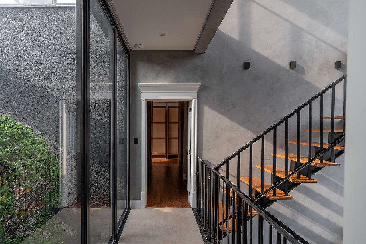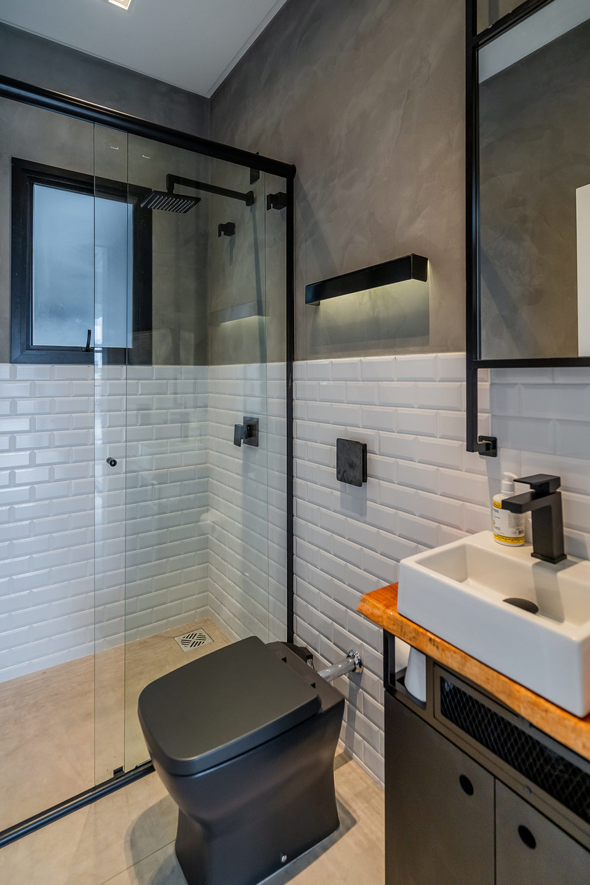 Esse sobrado imponente mistura alguns estilos com texturas e revestimentos, que trazem a harmonia e o conforto perfeitos para um lar. Os detalhes em madeira contrastam com os acabamentos industriais, ao mesmo tempo que a atenção se volta para a parede especialmente feita em pedras, ao lado da piscina.